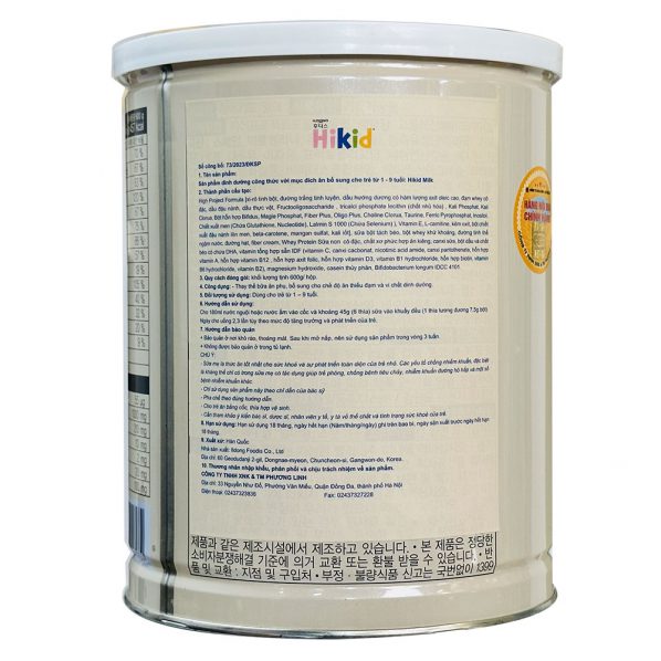 Sữa bột trẻ em Hikid được làm từ nguồn nguyên liệu thiên nhiên, an toàn cho sức khỏe của bé. Sản phẩm được sản xuất trên dây chuyền công nghệ hiện đại, trong quy trình sản xuất khép kín, đảm bảo vệ sinh cho bé. Các chất dinh dưỡng: Canxi, sắt, kẽm,… là những dưỡng chất thiết yếu trong giai đoạn tăng trưởng, giúp bé tăng trưởng chiều cao và khỏe mạnh hơn.