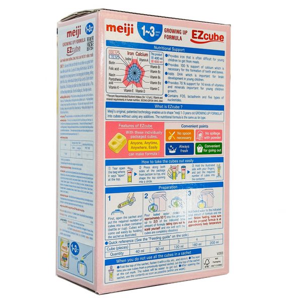 Với tính cách cầu toàn và đề cao yếu tố tiện dụng, Meiji đã áp dụng công nghệ Nhật Bản tiên tiến lần đầu tiên trên thế giới cô đặc thành viên sữa hình lập phương dễ hòa tan và tiện lợi khi đi ra ngoài hoặc du lịch. Một hộp sữa Meiji số 9 gồm 16 thanh (27g/thanh), mỗi thanh gồm 5 viên sữa.