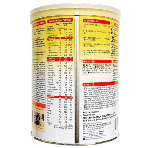 – Sữa Morinaga bổ sung 2 loại đường Oligosaccharide là Lactose và Rafinose giúp tăng cường vi khuẩn có lợi cho hệ tiêu hóa và ngăn ngừa táo bón. Loại đường có khả năng “đánh lừa” vi khuẩn, không cho thâm nhập vào cơ thể.